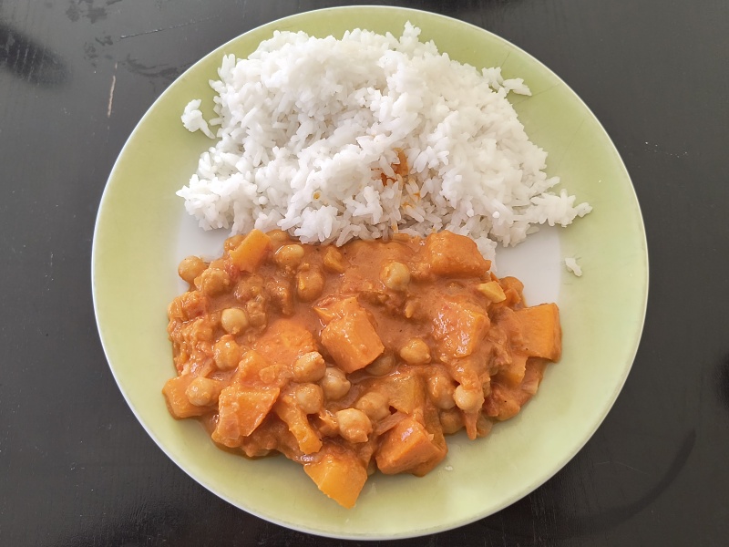 Od mých rodičů jsme dostali dýni Hokkaido. Polévku z ní vaříme běžně, ale já jsem chtěla zkusit něco nového. Vzpomněla jsem si na kamarádku, která z ní vaří dýňové kari. Nikdy mě to nelákalo, ale říkala jsem si, že by to mohl být fajn bezmasý recept. Z vyhledávače jsem vybrala hned ten první, který na mě vyskočil – Dýňové kari s cizrnou podle Kamu
