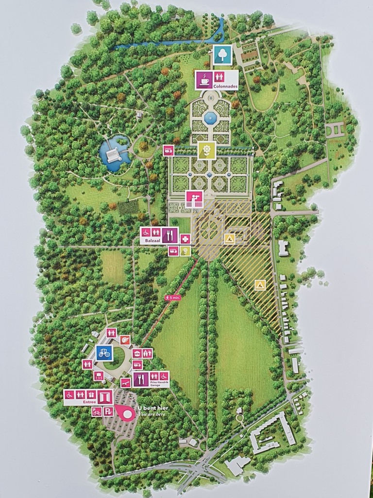 Tím, že máme Museumkaart, tak jsme vstup do zahrad měli zdarma. Hned za vstupem, kde je informační centrum a obchůdek se suvenýry, se nachází restaurace a stáje pro královské koně a auta. My jsme si tuto část však nechali až na konec a šli rovnou do královských zahrad.