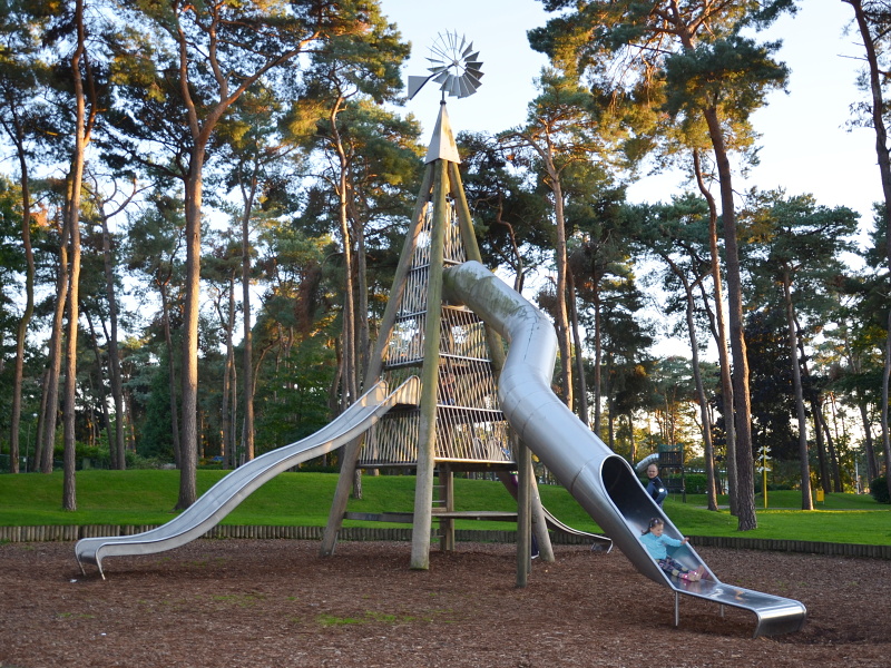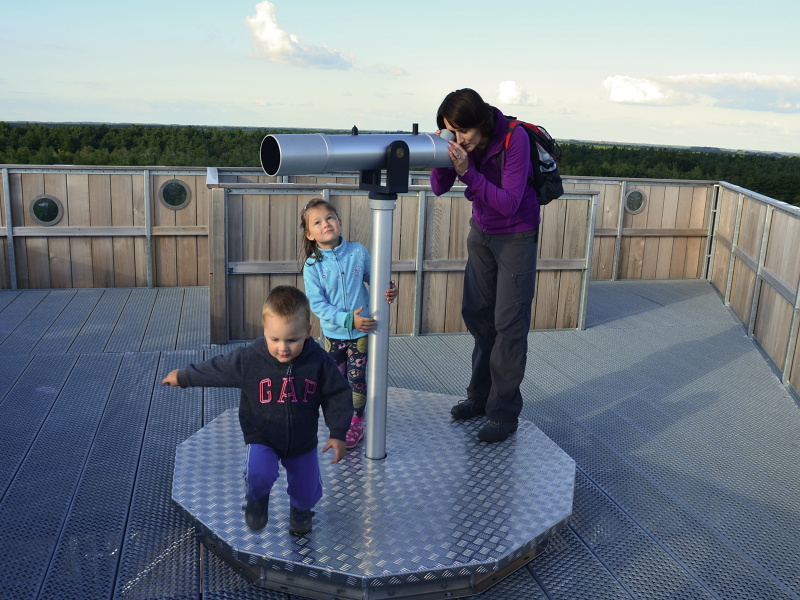 Rozhledna, ke které jsme po chvíli dorazili, byla nádherná. Nejdřív jsme sbaštili svačinu, a poté jsme se vydali na vrch – i Ondra vylezl nahoru po svých. Výhled byl pěkný, jen je škoda, že je rozhledna na takové placce. Cestou zpět jsme ještě mrkli na zajímavý visutý most pro pěší přes Albert kanál. Děti jsme řádně unavili, ale stejně jim „potvůrkám“ zbylo ještě dost sil na hřiště. Prošli jsme všechny průlezky a i já se na konci vyblbl na kládách postavených do výšky.
